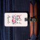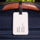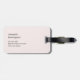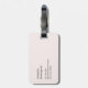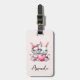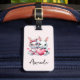 A luggage tag with an illustration featuring 2 white furry bunnies sharing a big pink heart. The girl bunny is wearing a cute bow on her head and heart-shaped glasses. The boy bunny is wearing an adorable little suit with a tie.