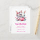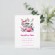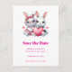 Save the date postcard with an illustration featuring 2 white furry bunnies sharing a big PINK heart. The girl bunny is wearing a cute bow on her head and heart-shaped glasses. The boy bunny is wearing an adorable little suit with a tie.