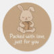 This adorable round kraft-style sticker features a cute bunny hugging a gift box with the words "Packed with love, just for you." It's perfect for small business packaging, handmade orders, gift bags, and thank you labels. The warm tones and sweet character add a delightful, personal touch to your parcels. Ideal for baby showers, bakeries, or boutique branding.