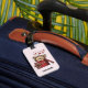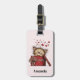 A luggage tag with a cute drawing of a little kitten poking its head out of a gift box.