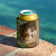 Portrait photo of a cat with clear green eyes climbing a tree on a sunny day.