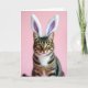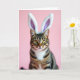 This design shows a tabby cat posed against a soft, single-tone pink background, wearing oversized white faux-fur bunny ears with pale lavender inner panels 🐰. Its coat mixes warm browns, deep blacks, and creamy whites in detailed stripes that feel cozy and familiar, like a close companion curled nearby. The cat’s golden-green eyes meet yours with a gentle, curious look that reads like quiet affection rather than mischief. A bright white patch of chest fur stands out at the center, and long white whiskers fan from the muzzle like fine threads. Subtle, even lighting smooths the scene and brings out the plush texture of the ears and the layered fur patterns without harsh shadows. There’s no visible headline or message on the front, leaving the portrait to do the talking 🌷. The only elements in view are the cat, the fluffy ears, and the uninterrupted pink backdrop.