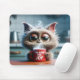 A fluffy, wide-eyed cat holds a steaming red mug with the words "Unleash the Joy"