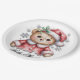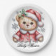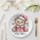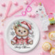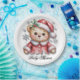 A delicate watercolor illustration of an adorable teddy bear with long, curly eyelashes and rosy pink cheeks, wearing a festive red Santa hat adorned with a sprig of green mistletoe. The bear is dressed in a cozy red jacket featuring fluffy white fur trim and pearl-white buttons, with soft watercolor washes creating gentle color transitions. The teddy bear displays a sweet, gentle smile that radiates warmth and holiday cheer. Behind the bear, shimmering silver glitter snowflakes drift across a soft, pale background, creating a magical Christmas atmosphere with subtle watercolor bleeds and ethereal winter charm.