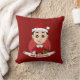 Throw pillow with an illustration of a cute smiling caucasian boy with short black hair, the boy is wearing a Santa Claus costume with a red hat and holding a present; in a red circle on a red background, a Christmas holidays design with an editable text template for your name or message