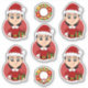 Set of seven cut-vinyl stickers with an illustration of a cute little happy smiling girl with short black hair, who is dressed in Christmas clothes and is wearing a red Santa Claus hat, on a red background; five stickers of the girl and two stickers with a Christmas wreath