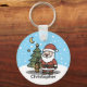 Add your name to personalize this cute Christmas Santa keychain. Spread some festive holiday cheer with this cute, cartoon Father Christmas wearing a red and white Santa hat and outfit, standing next to a green Christmas tree that is adorned with colourful lights and a yellow star. He is holding a lantern to shed some light on the snowy winter scene. below the illustration is a template to add your name to customize.