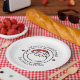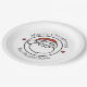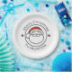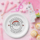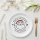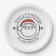 This paper plate features a black doodle art line drawing of a cute Santa Claus with a red hat within a circle, with “Merry Christmas” greeting above and a family name below, and with red dots separating the two. Both the greeting and family name can be personalized right on the product page.