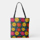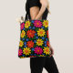 A lively garden of color blooms against a deep black backdrop, featuring flowers in pink, yellow, orange, and red‑orange, framed by soft green leaves and accented with petite blue flowers that add a playful pop of contrast. The bold palette and clean symmetry create a joyful, eye‑catching design that feels both modern and whimsical — perfect for brightening everyday errands or adding a touch of artistic charm to your look.