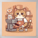 A cute, funny cartoon barista cat with a brown and yellow cozy coffee shop background.