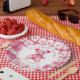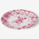 Pink and white crocheted teddy bear girl's baby shower personalized paper plates. An adorable pink teddy bear crocheted with pink and white yarn adds the sweetest touch.