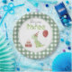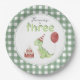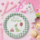 Watercolor kids birthday party. Watercolor Dino in birthday hat, cake with candles, red balloon. Green cage background.