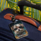 "Where we going?" text over a cute dog photo (can be changed to your dog) on a luggage tag that features a business card slot on the back.