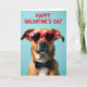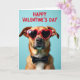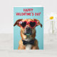 This greeting card shows a light-brown dog facing forward against a smooth teal background. The dog’s head and upper chest fill most of the card, and its mouth looks relaxed and calm. It’s wearing shiny red heart-shaped sunglasses that sit across its snout and steal the spotlight ❤️. A neat black bow tie is tied at its neck, giving the dog a dressed-up, funny look. The fur is shown in warm tan and caramel shades, with extra detail around the muzzle and chest that makes it look soft. Near the top, the message “HAPPY VALENTINE’S DAY” appears in red block letters, standing out clearly above the dog 💌.