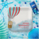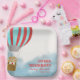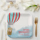 Paper plate for a baby shower features a cute cub in a hot air balloon flying above the clouds describing the journey for the baby to come.
