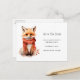 Save the date postcard with an illustration of a reddish orange fox pup. A subtle smile on his face. Wearing a nice red scarf for warmth.