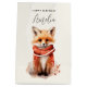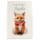 Gift bag with an illustration of a reddish orange fox pup. A subtle smile on his face. Wearing a nice red scarf for warmth.