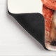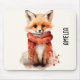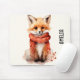 Mouse pad with an illustration of a reddish orange fox pup. A subtle smile on his face. Wearing a nice red scarf for warmth.