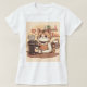 A Cute Funny Barista Cat with Coffee T-shirt with a soft brown and yellow cozy coffee shop background.