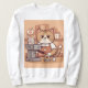 A cute funny cartoon barista cat with a brown and yellow cozy coffee shop background.