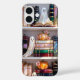 Cozy and charming, this phone case features a Halloween bookshelf filled with books, cute ghosts, and glowing pumpkins in a stained-glass–inspired design.