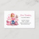 This eye-catching business card showcases a delightful, illustrated character holding cleaning supplies, surrounded by sparkling bubbles and professional cleaning equipment, including a mop, vacuum cleaner, and cleaning caddy. The playful yet professional pink and white color scheme conveys cleanliness, trustworthiness, and attention to detail—essential qualities clients seek in their housekeeping provider.