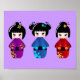 On this item, you see 3 cute kawaii kokeshi dolls on a purple background.
