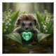 A cute hedgehog holding an emerald heart peeks out from a patch of lilies of the valley in a peaceful forest.