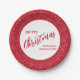This design features a Christmas holiday calligraphy script paper plate with a merry Christmas cute typography, a simple minimalist minimal, cute simple calligraphy script, stylish trendy typography lettering, stylish trendy classic classy timeless, festive minimalist minimal traditional, festive holiday red and white, a creative simplistic elegant elegance, holiday party disposable paper supplies