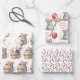 Adorable birthday gift wrapping paper with a little gray mouse holding a balloon with text you can edit to add a name in the personalize area. The second sheet has a little mouse holding red birthday balloon. The third sheet is pink, red, blue and yellow sprinkles.