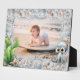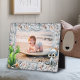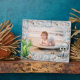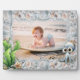 Personalized photo frame for a child's picture. Cute, big-eyed octopus, starfish, and seaweed decorate this pretty, seashell photo frame. The pink and blue shell design is outlined with splashing waves. Upload a favorite photo of a son, or daughter, and personalize with name and age at the top. Size 8 x 10 inches with easel attached to stand on a table, dresser or countertop. Create as a keepsake for new parents, or a gift for the grandparents.