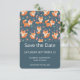 Save the Date mit einem Muster aus niedlichen und fröhlichen Orangenfüchsen. Dunkelgrüner Hintergrund. Kleine Pilze sprengen herum.