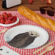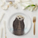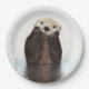 Papier Teller mit einem Foto eines niedlichen Otters stehend aufrecht im Wasser mit seinen Pfoten halten sein Gesicht. Sein Kopf kauerte zum links, süß und bezaubernd aussehend.