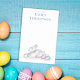 This design features a cute simple easter bunny holiday, a minimalist minimal classic spring, a traditional easter rabbit animal, a traditional pastel colored easter eggs, a cute adorable white fluffy bunny, a classic easter spring artwork, a custom personalized notepad notepads, a home office school gift idea, an elegant vintage classic easter bunny, a pastel-colored easter bunny notes