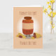 Greeting Card with an illustrated design of a smiling peanut butter jar that is standing between two piles of peanuts. The words “Peanut Butter? Peanut Better!” show above and below the cartoon character. All of the words can be customized.