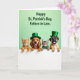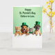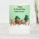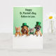 This card shows four friendly pets lined up in a row, peeking over a bright white ledge as if they’ve gathered close for a shared moment. On the left, an orange tabby kitten leans forward with curious eyes, angled toward a golden puppy whose long ears frame a gentle, affectionate grin. The puppy wears a small green top hat, and beside it a striped tabby kitten looks calmly toward the group with an emerald bow tie that feels like a sweet nod to friendship 💚. At the far right, a fawn-colored dog with a stout nose sticks out its tongue in an easygoing, companionable way, topped with a taller green hat finished with a gold buckle detail ☘️. Behind them, the background fades through a light green gradient that keeps the scene airy and festive without distracting from their faces. Near the top, dark green lettering sits centered above the animals, standing out clearly against the pale green backdrop. Soft lighting brings out the fur textures and rounded cheeks, while the white ledge runs straight across the bottom like a neat stage for their paws and hats.