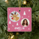 Cute Pink Reindeer Kid`s Name Photo Merry Christmas Ceramic Ornament. Cute deer on a pink background with white snowflakes, stars and trees. This ornament has a name and a photo template - personalize it with your name and photo.