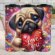 This charming digital illustration features an adorable, wide-eyed pug puppy holding a large, ornate red heart that reads "Love you" in elegant white script. The puppy is rendered with soft, realistic fur textures and expressive blue eyes, creating an instant emotional connection. The background is a vibrant, kaleidoscopic explosion of swirling colors, glittering stardust, and dozens of floating hearts in various shades of blue, pink, and gold. This seamless-style graphic is designed as a full-wrap for insulated tumblers, offering a high-impact, 360-degree visual experience. The playful character design and rich, festive color palette make it a perfect gift for dog lovers, Valentine Day celebrations, or any special occasion centered on affection and joy.