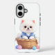 An adorable fluffy puppy sitting in a basket wearing a cute blue outfit. A soft and charming design perfect for dog lovers and kawaii fans.