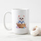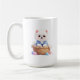 An adorable fluffy puppy sitting in a basket wearing a cute blue outfit. A soft and charming design perfect for dog lovers and kawaii fans.