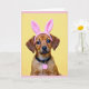 This card shows a young dog centered on a sunny pastel-yellow background, looking forward with big dark eyes that catch a tiny glint, like it’s sharing a gentle, friendly gaze. A pink headband sits between its ears, topped with tall plush bunny ears 🐰 that add a sweet seasonal touch. The dog’s short russet fur is softly detailed and stands out warmly against the smooth yellow field, giving the scene a cozy, affectionate feel. Around its neck is a slim black collar with a small round pink tag, like a simple little token from someone who cares. A thin pink border frames the picture and ties in with the headband for a tidy, coordinated look 🌷. Any greeting text is placed near the top in a soft pink color, leaving the dog’s face clear and inviting in the middle. The lighting is gentle and even, smoothing the shadows and making the eyes and fur look extra tender. The final detail is the narrow pink frame line running evenly along all four edges of the yellow background.