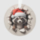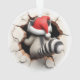This delightful, double-sided ornament showcases an adorable 3D racoon. The front features it peeking from a cracked opening, radiating holiday cheer with its red Santa hat and bright eyes. The back complements, showing the racoon from behind. This charming piece offers a full festive view, perfect for your holiday tree.