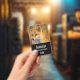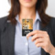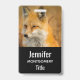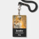 Ein Namensschild mit einem schönen Foto eines roten Fuchses im Herbst. Stehend in der Wildnis unter dem Pinsel.