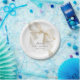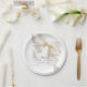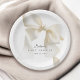A stylish baby shower napkin with a cute, neutral bow in ivory beige. The bow adds a playful yet sophisticated flair and is a popular choice for girl, boy, gender-neutral baby, or when the gender of the baby is unknown. The background is clean, white allowing the bow to stand out. Below the bow, the text is arranged in a modern, minimal layout, using an elegant font choice. Plates are available in 2 sizes: shown here in the smaller 7-inch diameter size, they are also available in a 9-inch diameter size.