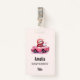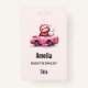Name badge with an adorable illustration. A happy looking sloth sitting in a sporty pink convertible. Waving as he drives by. With hearts floating upwards.