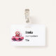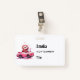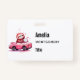 Name badge with an adorable illustration. A happy looking sloth sitting in a sporty pink convertible. Waving as he drives by. With hearts floating upwards.