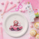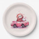 Paper plates with an adorable illustration. A happy looking sloth sitting in a sporty pink convertible. Waving as he drives by. With hearts floating upwards.