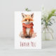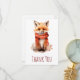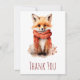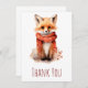 Thank you card with an illustration of a reddish orange fox pup. A subtle smile on his face. Wearing a nice red scarf for warmth.