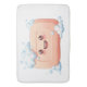 An adorable cartoon illustration of a pink soap bar character, smiling happily with big shiny eyes and rosy cheeks. The soap is surrounded by fluffy white and blue bubbles, giving it a clean and cheerful vibe. Perfect for hygiene or bath-themed designs.