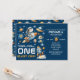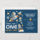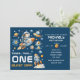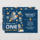 With its navy blue and orange color palette, this gender-neutral invitation is perfect for any baby boy or girl who loves space adventures. The playful “3…2…1… Blast Off!” slogan adds excitement and sets the tone for a fun cosmic-themed first birthday party.